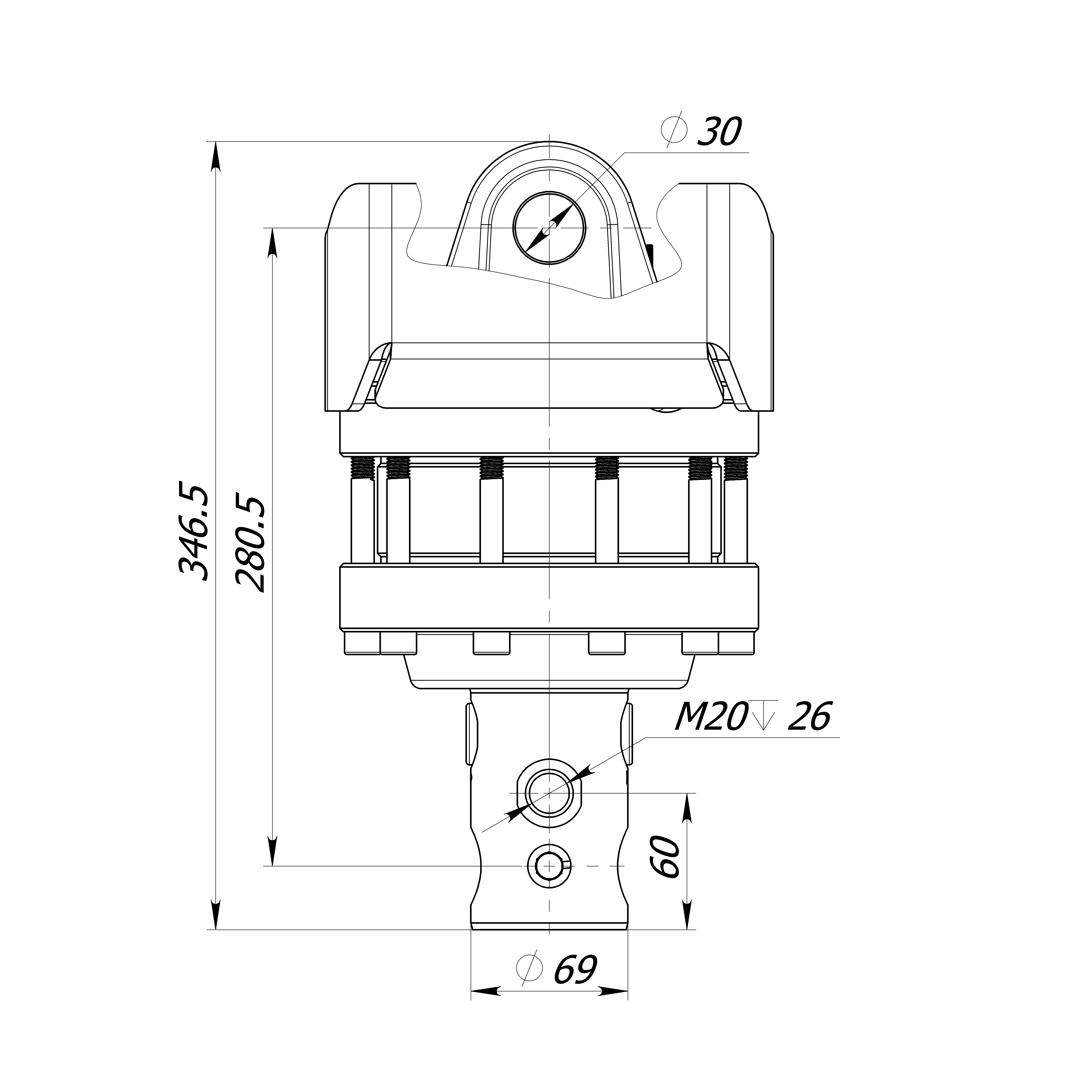 Нижняя часть ротатора исполнена в виде вала для соединения с грейфером через монтажный цилиндр (стакан) и фиксацией при помощи оси (пальца). Диаметр оси (пальца) равен 69мм и диаметр пальца (в комплект не входит) 30мм