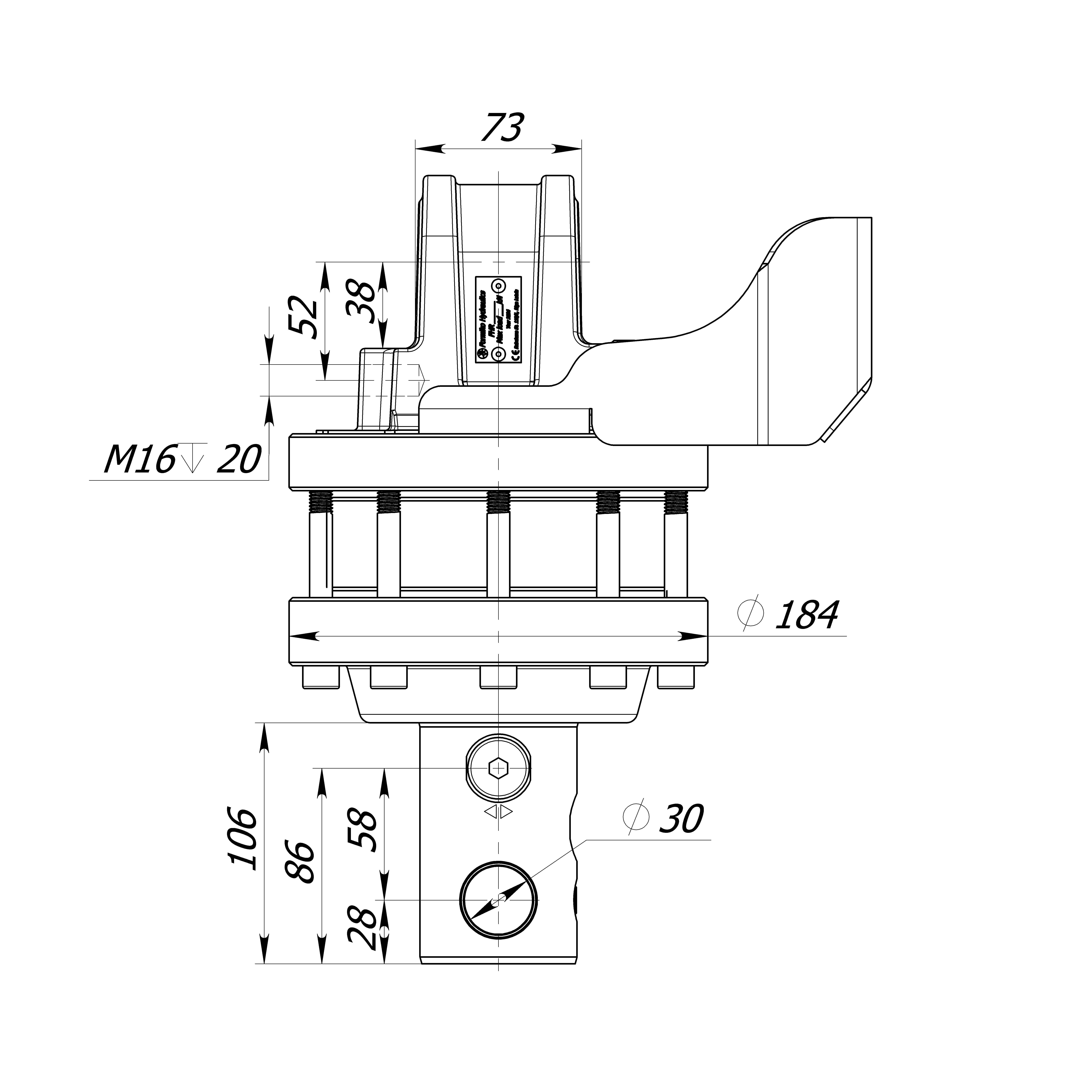 Верхняя часть ротатора выполнена в виде одиночной проушины для шарнирного соединения. Крепкая и надёжная конструкция, позволяющая выдерживать перегрузки. Ширина одиночной проушины является стандартной 73мм и диаметр оси (пальца) 30мм.