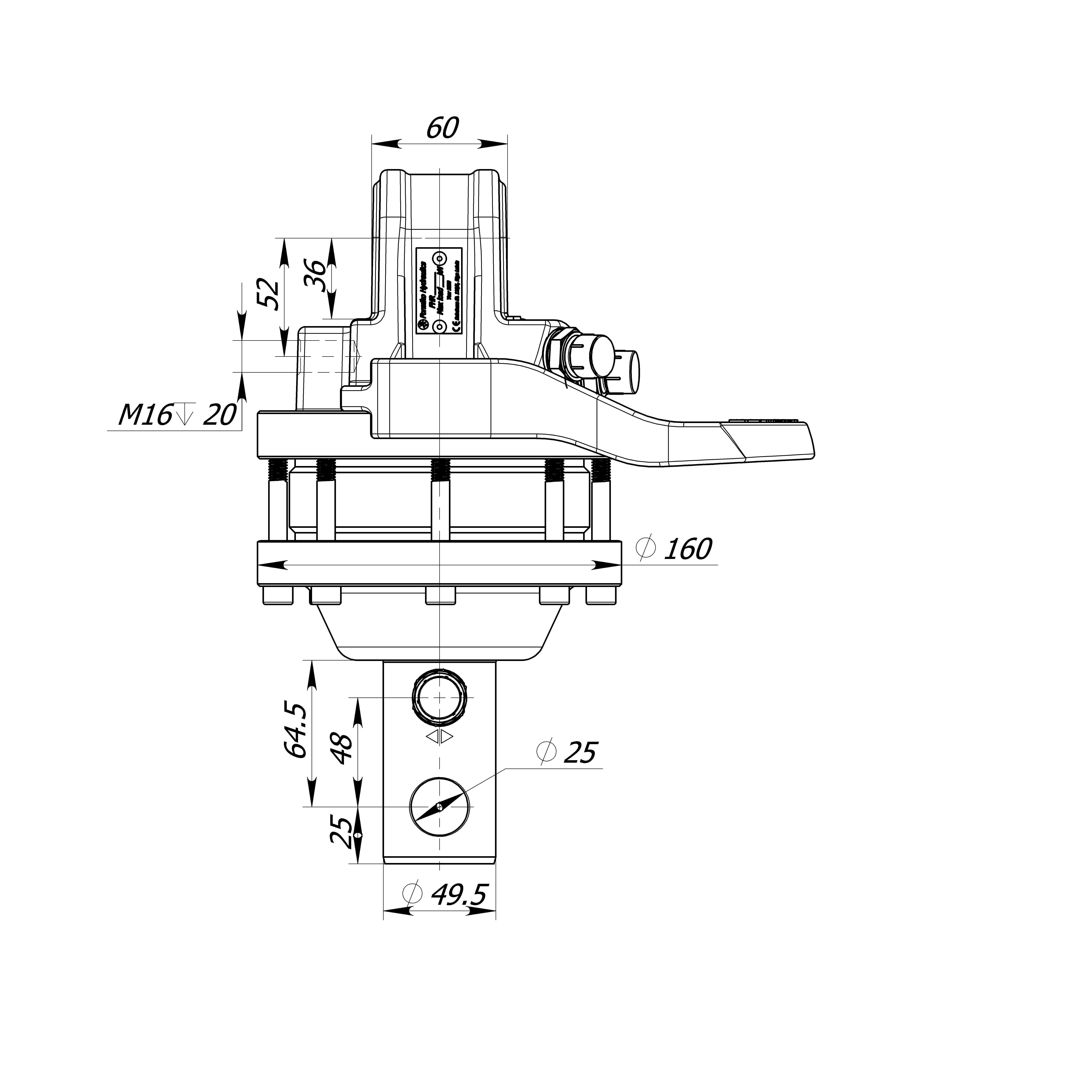 Верхняя часть ротатора выполнена в виде одиночной проушины для шарнирного соединения. Крепкая и надёжная конструкция, позволяющая выдерживать перегрузки. Ширина одиночной проушины является стандартной 60мм и диаметр оси (пальца) 25мм.